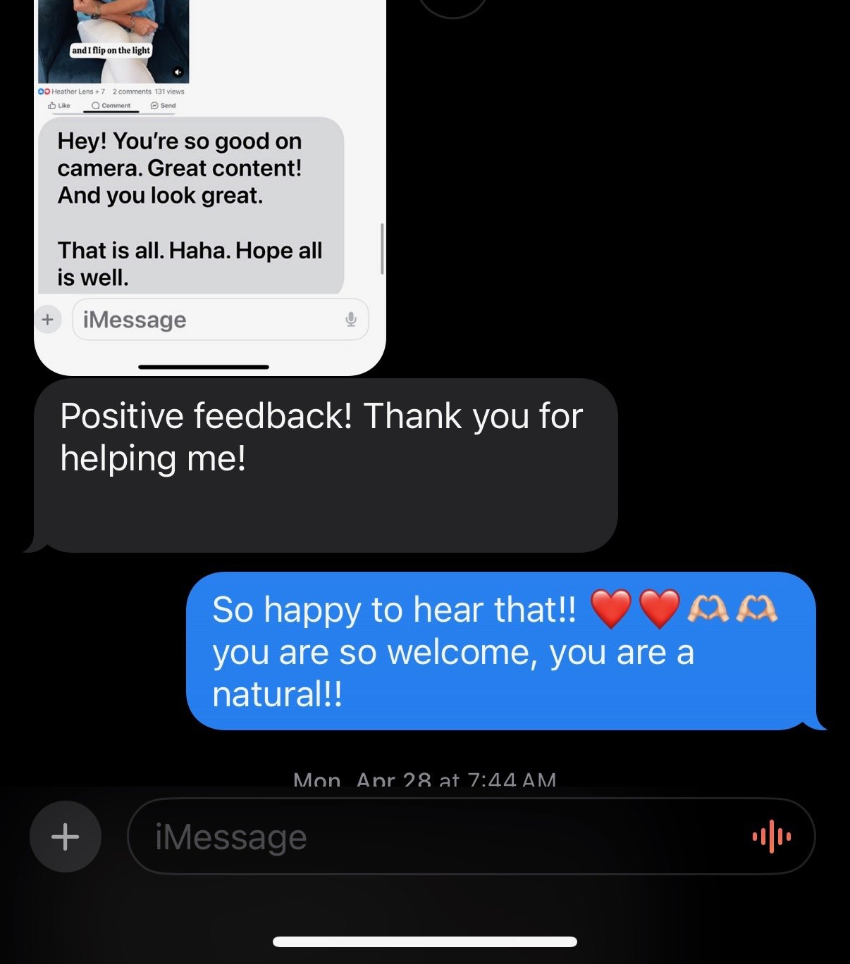 "She is the best! I get a lot of compliments for me posts on Instagram and Facebook. I definitely recommend her services."